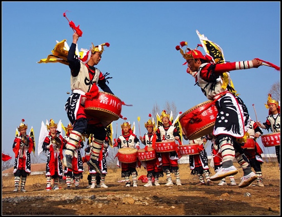The drum dance Luochuan Bie Drum is a national intangible heritage. "Bie" means "to jump" in the dialect of Shaanxi and this dance is characterized by jumping movements. Bie drum dance comes from the evolution matrix troops.
