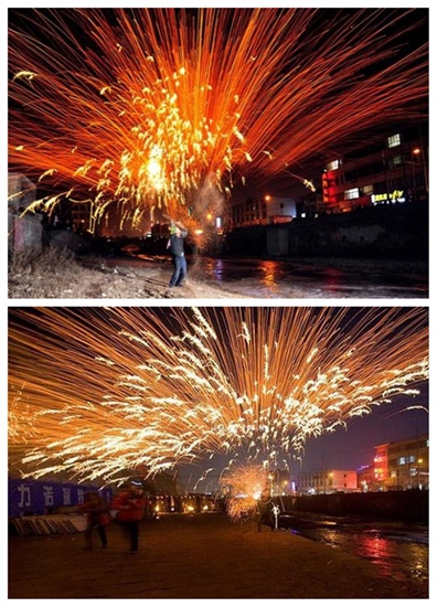 In Mizhi county, iron water splashing performance is held to celebrate Lantern festival on Jan 15 of Chinese lunar calendar. The show is very spectacular especially when performed in the evening.