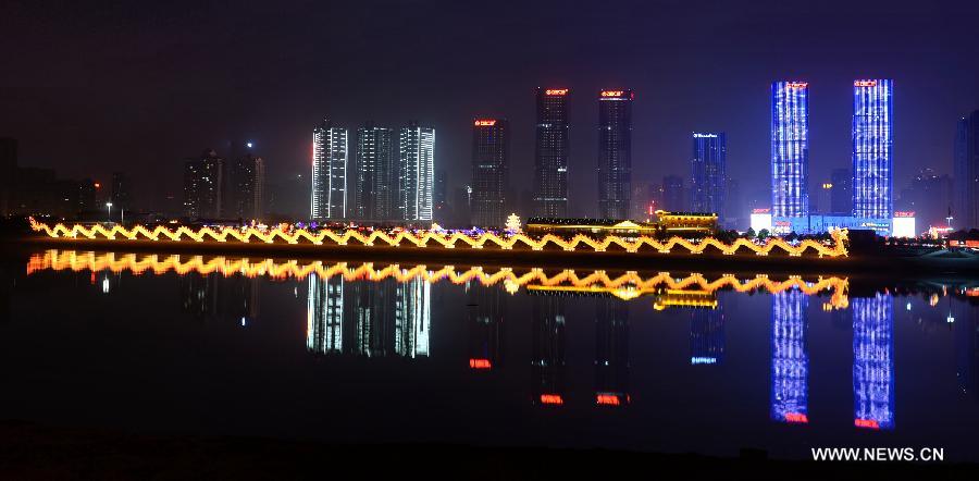 A dragon-shaped light illuminates the Juzizhou island in the Xiangjiang River in Changsha, capital of cantral China's Hunan Province, Feb. 12, 2015, to welcome the Chinese Spring Festival, or lunar New Year which starts from Feb. 19 this year. (Xinhua/Long Hongtao)