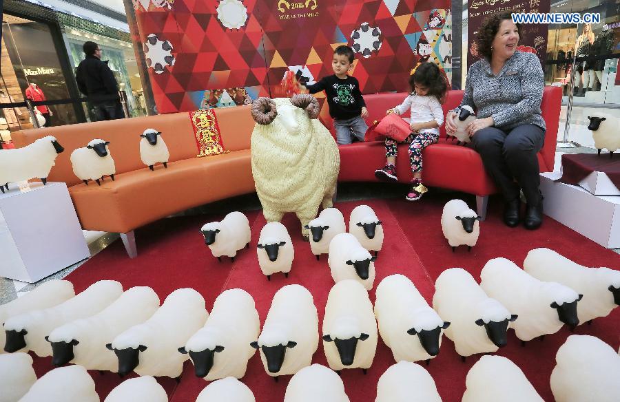 | People sit beside sheep lanterns displayed at a shopping mall in Vancouver, Canada, Feb. 12, 2015. About 180 sheep lanterns are installed at a shopping mall in Vancouver to celebrate the upcoming lunar year of the Sheep. (Xinhua/Liang Sen) |
