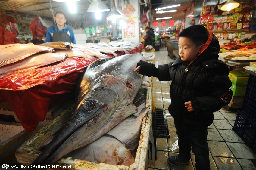 A swordfish measuring 2.77 meters long and weighing 135 kilograms is for sale at a fish stall in Qingdao, east China’s Shandong province. The fish was caught by local fishermen in the Yellow Sea near Qingdao. (CFP/Wang Haibin)