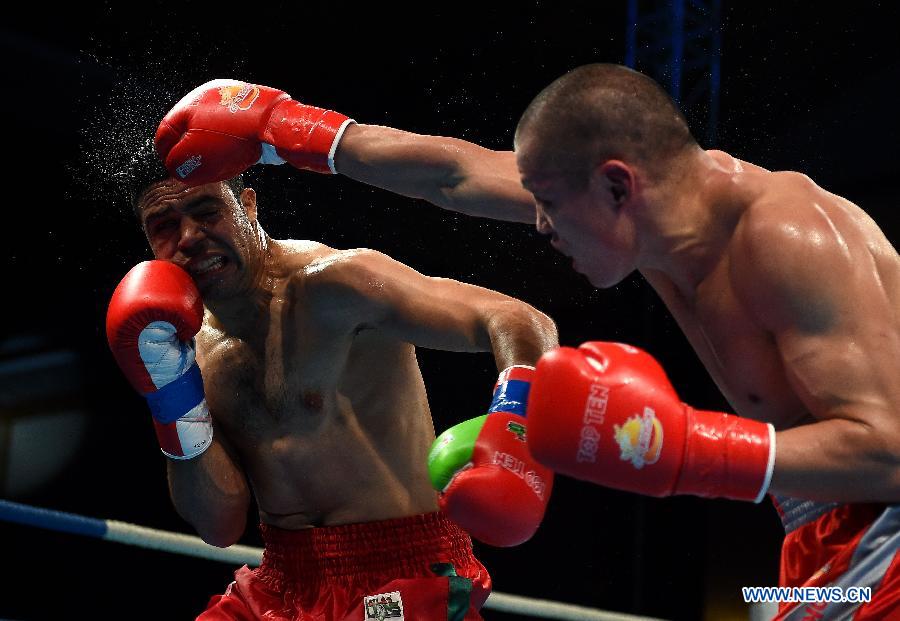 Zhou Di (R) of China fights against Harnouf Said of Morocco during their men's 75kg match at the World Series of Boxing (WSB), in Sanya, south China's Hainan Province, February 13, 2015. China won with 4-1 in total. (Xinhua/Guo Cheng)