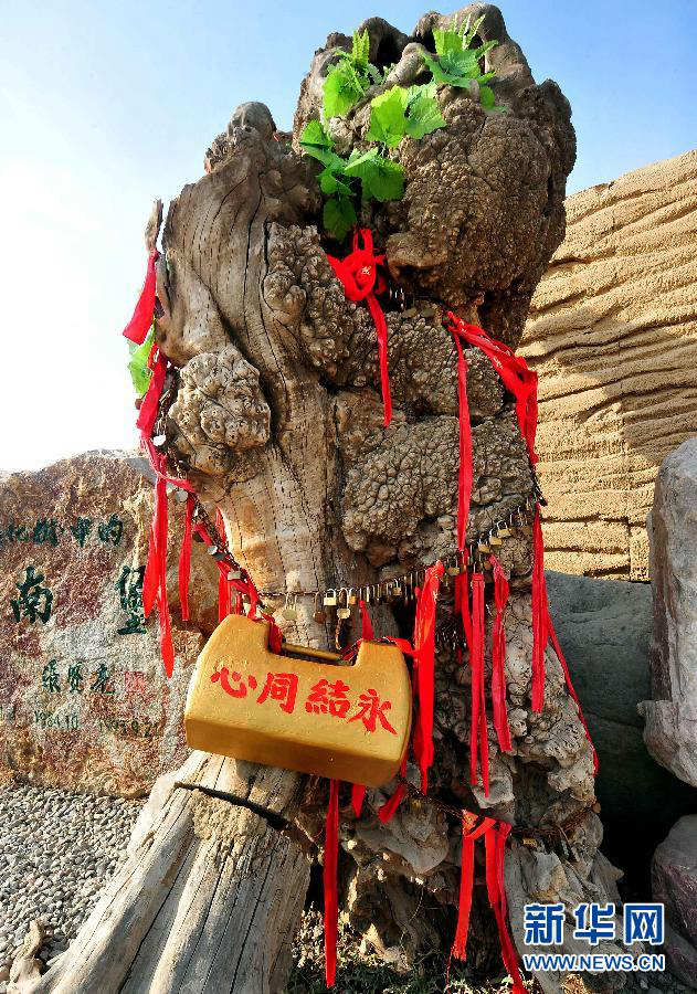 A huge love lock hung on a tree stump in front of the China West Film Studio scenic area, Ningxia Hui Autonomous Region, Oct. 21, 2010. (Xinhua/Wang Song)