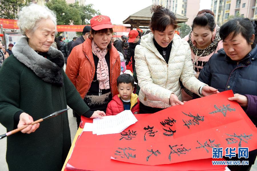 Residents write Spring Festival couplets in a commnitiy temple fair in celebration of upcoming Chinese Lunar New Year in China's Anhui, Feb. 14, 2015. (Source:Xinhuanet)