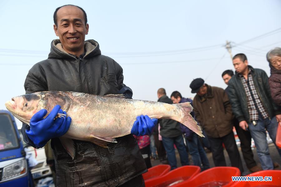 A seller holds a big frozen fish for sale at a market in Shenyang, capital of northeast China's Liaoning Province, Feb. 15, 2015. Local residents are busy with purchasing goods for the coming Spring Festival, which falls on Feb. 19 this year. (Xinhua/Pan Yulong)