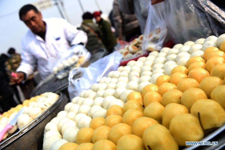 A vendor sells fry stick bean bundle, a snack of northeast China's region, at a market in Shenyang, capital of northeast China's Liaoning Province, Feb. 15, 2015. Local residents are busy with purchasing goods for the coming Spring Festival, which falls on Feb. 19 this year. (Xinhua/Pan Yulong)