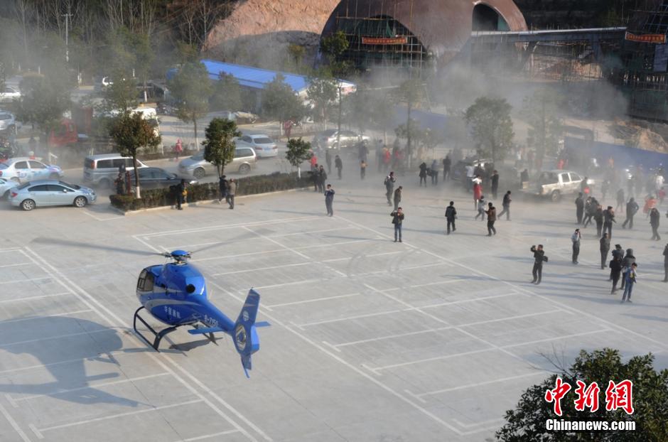 Central China's Hunan province launched its first helicopter sightseeing service in Shiniuzhai scenic spot, Pingjiang county on Feb. 12, 2015. The new service attracted many villagers, tourists and will promote the popularization of helicopter tour.