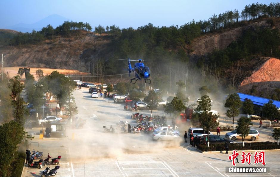 Central China's Hunan province launched its first helicopter sightseeing service in Shiniuzhai scenic spot, Pingjiang county on Feb. 12, 2015. The new service attracted many villagers, tourists and will promote the popularization of helicopter tour.