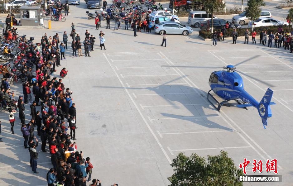 Central China's Hunan province launched its first helicopter sightseeing service in Shiniuzhai scenic spot, Pingjiang county on Feb. 12, 2015. The new service attracted many villagers, tourists and will promote the popularization of helicopter tour.