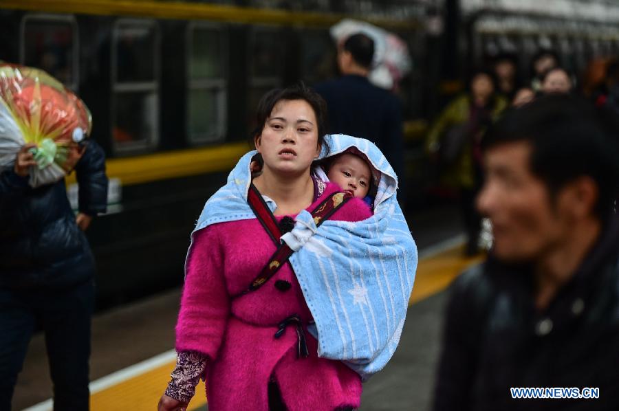 A baby is tied on its mother's back on the platform of Heifei Railway Station in Hefei, capital of esat China's Anhui Province, Feb. 15, 2015. The Heifei Railway Station is expecting to handle 880,000 trips on Sunday, four days ahead of the Spring Festival. Taking place annually ahead of the Spring Festival holiday, the travel spree, known as "Chunyun" in Chinese, is considered the world's largest human migration, with hundreds of millions of Chinese people traveling home to reunite with family. (Xinhua/Du Yu)
