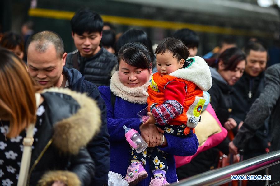 Passengers move to board a train in Heifei Railway Station in Hefei, capital of esat China's Anhui Province, Feb. 15, 2015. The Heifei Railway Station is expecting to handle 880,000 trips on Sunday, four days ahead of the Spring Festival. Taking place annually ahead of the Spring Festival holiday, the travel spree, known as "Chunyun" in Chinese, is considered the world's largest human migration, with hundreds of millions of Chinese people traveling home to reunite with family. (Xinhua/Du Yu)