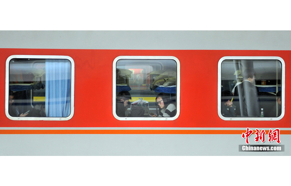 Photo shows the chunyun as seen through train windows in Beijing West Railway Station, Feb. 11, 2015.The Spring Festival travel rush, known as "chunyun", will enter its peak period. (CNS/Jin Shuo)