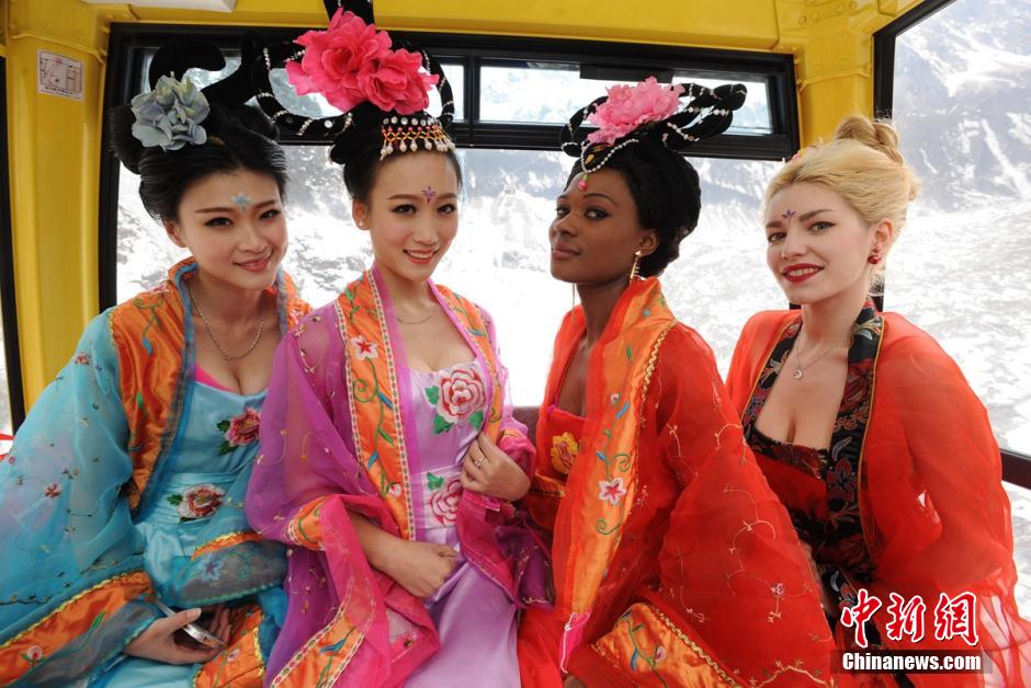 Located in southwest China’s Sichuan province, Hailuogou Valley is the lowest glacier zone in the world, and is a famous natural park in China. From Feb. 14 to Feb. 15, 2015, a group of “ancient beauties” played by models appeared at Hailuogou to attract tourists. Some models were dressed as the “God of Wealth” and handed out red envelopes to tourists. (Chinanews/Liu Zhongjun)
