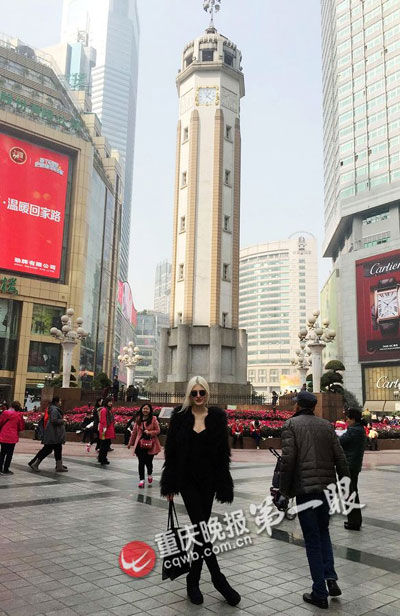 | A foreign model poses for a photo in front of the People's Liberation Monument.(cqwb.com.cn/Ren Jun) |