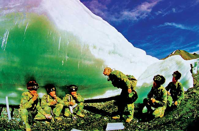 | Take a picnic by the icy lake, 5,380 meters above the sea level, at Shenxianwan, northwest China’s Xinjiang Uygur Autonomous Region.(Chinese Ministry of Defense/Zhou Chaorong) |
