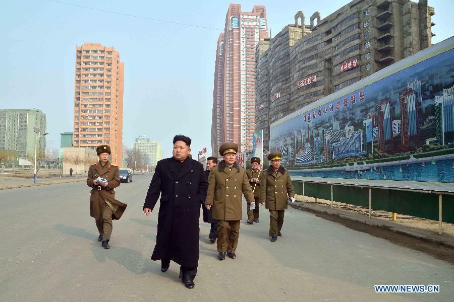 Photo provided by Korean Central News Agency (KCNA) on Feb. 15, 2015 shows top leader of the Democratic People's Republic of Korea (DPRK) Kim Jong Un (front) recently inspect the construction of the Mirae Scientists Street in Pyongyang after having a bird's-eye view of it from his special plane. (Xinhua/KCNA)
