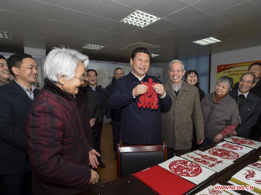 Chinese President and General Secretary of the Communist Party of China Central Committee Xi Jinping (C), also chairman of the Central Military Commission, holds a paper-cut work and offers Lunar New Year greetings to the Chinese people as he visits a community service center in Dianzicheng Subdistrict, Xi'an, capital of northwest China's Shaanxi Province, Feb. 15, 2015. Xi made a tour in Shaanxi on Feb. 13 - 16, and extended festival greetings to locals and people across the nation ahead of the Spring Festival, which falls on Feb. 19. (Xinhua/Li Xueren)