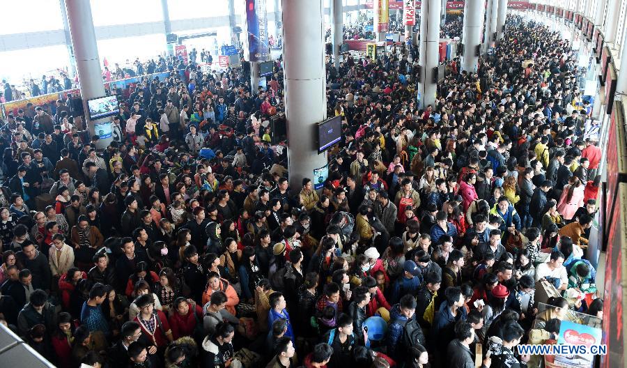 Passengers queue to get on coaches at Langdong Long-distance Bus Station in Nanning, capital of southwest China's Guangxi Zhuang Autonomous Region, Feb. 16, 2015. A travel rush came to its peak as passengers were hurry for home reunion during the Spring Festival or Chinese Lunar New Year, which falls on Feb. 19 this year. (Xinhua/Lu Bo'an)