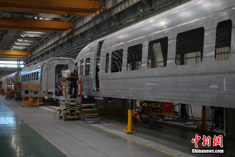 Photo shows the birth of high-speed trains at workshops in CNR Tangshan Railway Vehicle Co., Ltd. During the Spring Festival travel rush, known as "chunyun", the high-speed rail plays an irreplaceable role with its high-speed, stability and high-density. In 2014, the CNR export turnover reached 3 billion US dollars, an increase of 68.6 percent compared with the previous year. (CNS/Yang Kejia)