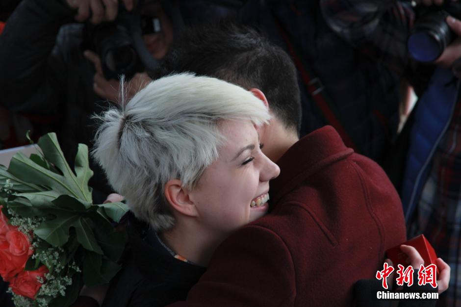 26-year-old Ukraine girl Sasha, dressing in a panda suit, proposes to his Chinese boyfriend on the Valentine's Day in the street of Dujiangyan in southwest China's Sichuan province. One year ago, she came to travel in China and fell in love with her Chinese boyfriend. (Photo/CNS)