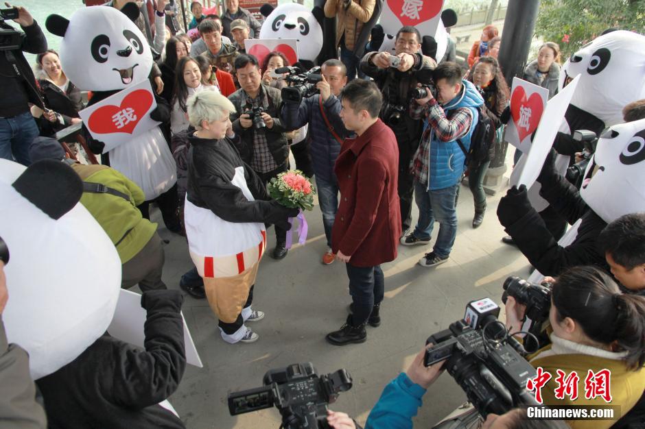 26-year-old Ukraine girl Sasha, dressing in a panda suit, proposes to his Chinese boyfriend on the Valentine's Day in the street of Dujiangyan in southwest China's Sichuan province. One year ago, she came to travel in China and fell in love with her Chinese boyfriend. (Photo/CNS)