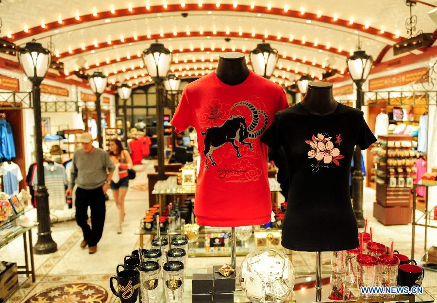 Souvenirs celebrating Chinese Spring Festival are seen at a hotel shop in Las Vegas, the United States, Feb. 15, 2015. The Chinese Spring Festival falls on Feb. 19 this year.(Xinhua/Zhang Chaoqun)