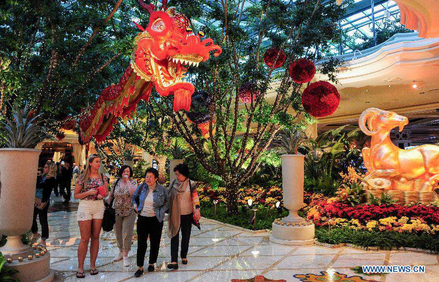 People walk past decorations celebrating Chinese Spring Festival at Wynn Hotel in Las Vegas, the United States, Feb. 15, 2015. The Chinese Spring Festival falls on Feb. 19 this year.(Xinhua/Zhang Chaoqun)