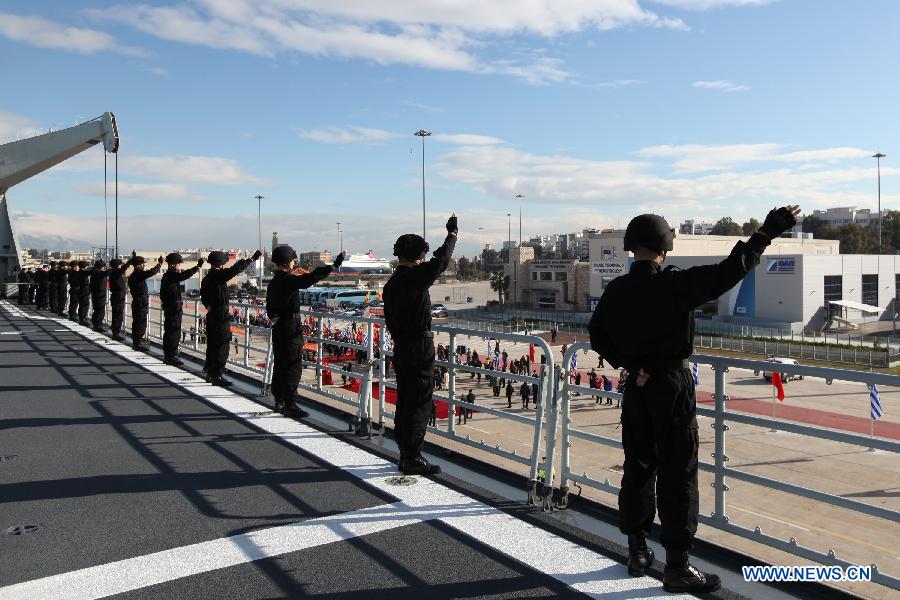 Chinese navy soldiers wave hands on the deck of amphibious landing ship Changbaishan as it sits docked in the harbour of Piraeus, Greece, Feb. 16, 2015. The 18th Chinese naval escort fleet arrived in the Greek port of Piraeus on Monday morning, commencing a four-day goodwill visit after such visits to Greece in 2002 and 2010. (Xinhua/Zhang Yuelin)