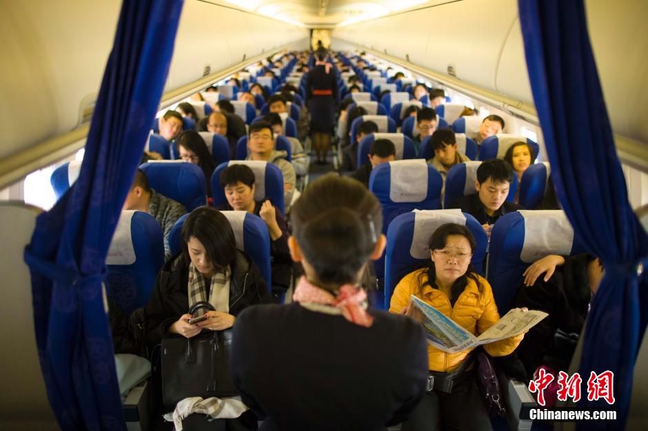 Before the flight takes off, flight attendants introduce emergency exits to the passengers on board on Feb. 15, 2015. (CNS/Zhang Yun)