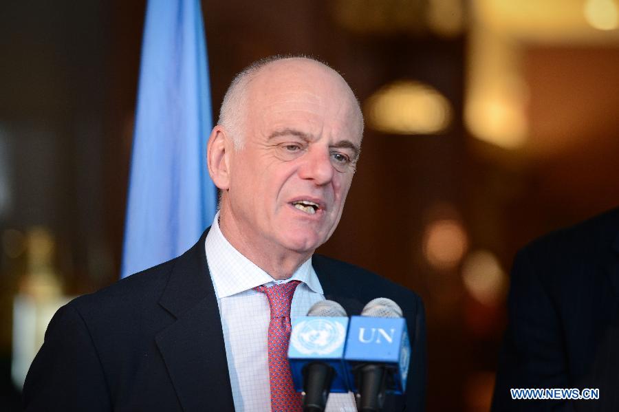 David Nabarro, the UN Secretary-General's Special Envoy on Ebola, addresses the press after briefing the UN General Assembly concerning the public health crisis emanating from the Ebola virus outbreak, at the UN headquarters in New York, on Feb. 18, 2015. (Xinhua/Niu Xiaolei)