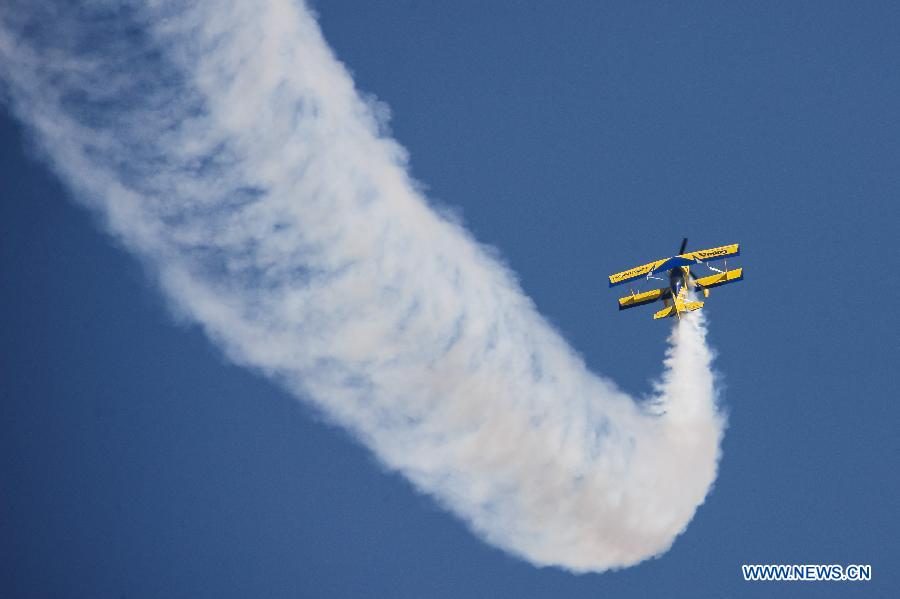 An aircraft performs aerobatics during the inauguration of the Aero India 2015 in Air Force Station Yelahanka of Bangalore, India, Feb. 18, 2015. The biennial air show this year attracted dealers from 49 countries, showcasing their aero-related products in military and civilian fields. (Xinhua/Zheng Huansong)