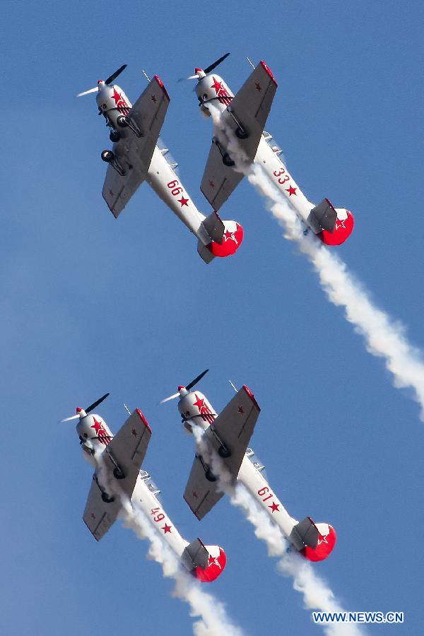 An aerobatic team performs during the inauguration of the Aero India 2015 in Air Force Station Yelahanka of Bangalore, India, Feb. 18, 2015. The biennial air show this year attracted dealers from 49 countries, showcasing their aero-related products in military and civilian fields. (Xinhua/Zheng Huansong)
