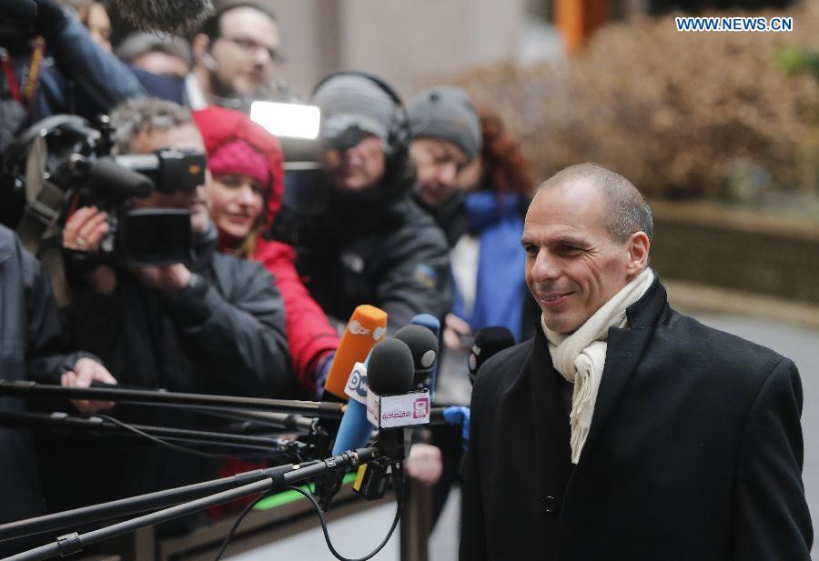 | Greek Finance Minister Yanis Varoufakis arrives at an extraordinary meeting of the Eurogroup finance ministers focusing on Greece's request for a six-month extension of the four-year bailout loan agreement in Brussles, Belgium, Feb. 20, 2015. Germany rejected a request from Greece on Thursday to extend its loan agreement with eurozone creditors, saying the Greek proposal did not meet previously agreed criteria decided by the Eurogroup on Monday.(Xinhua/Zhou Lei) |