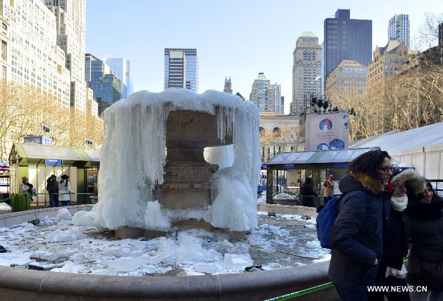 People take photos of the frozen fountain at Bryan Park, in New York City, the United States, on Feb. 20, 2015. New York City Emergency Management has issued a weather alert for dangerous cold temperatures for Feb. 20, followed by a wintry mix of snow, sleet and freezing rain. A bitterly cold chill known as the "Siberian Express" has enveloped much of eastern America, sending temperatures plummeting below their normal February levels to record lows in at least 100 places. (Xinhua/Wang Lei)