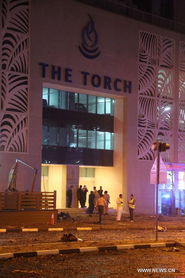 | People gather at the Marina Torch which caught fire on early Saturday morning in Dubai, the United Arab Emirates (UAE), Feb. 21, 2015. The 79-story Marina Torch, one of the world's tallest building in Dubai Marina district, caught fire at 2:00 a.m. (2200 GMT Friday) Saturday and thousands of residents were evacuated from the high-rise Marina Torch and the neighboring buildings. (Xinhua/Li Zhen) |