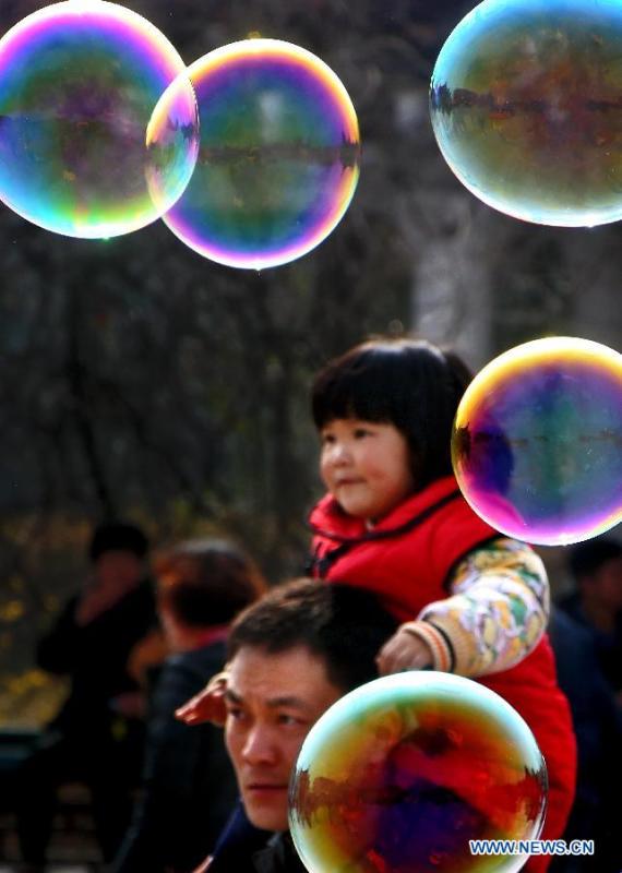 A tourist carries his child on the neck as they visit a temple fair in Luoyang, central China's Henan Province, Feb. 21, 2015. (Xinhua/Wang Song)