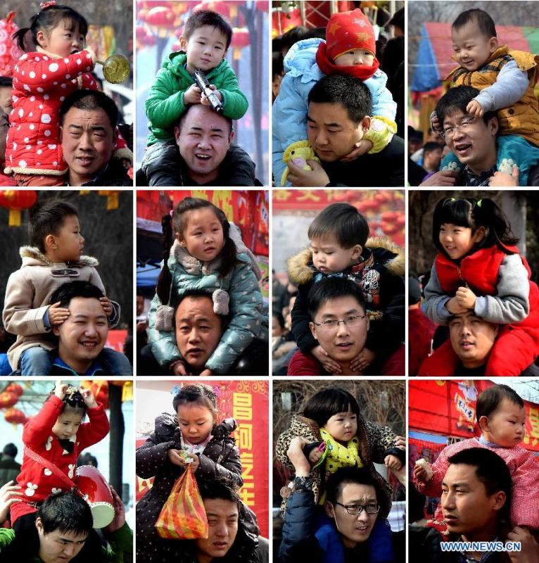 Combination photo taken on Feb. 21, 2015 shows tourists carrying their children on the neck at a temple fair in Luoyang, central China's Henan Province. (Xinhua/Wang Song)