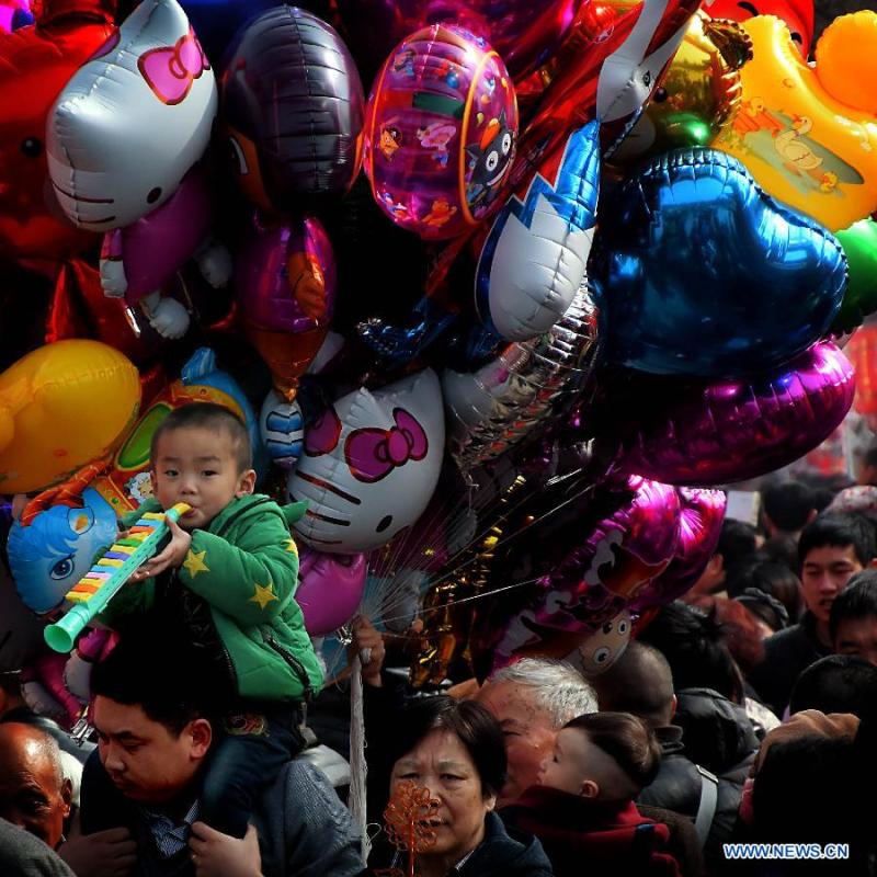 A tourist carries his child on the neck as they visit a temple fair in Luoyang, central China's Henan Province, Feb. 21, 2015. (Xinhua/Wang Song)