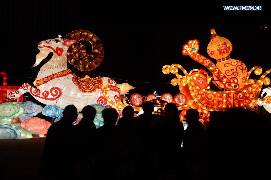 People watch a giant lantern at a lantern show which is to celebrate the Spring Festival in Xining City, capital of northwest China's Qinghai Province, Feb. 22, 2015. (Xinhua/Zhang Hongxiang)
