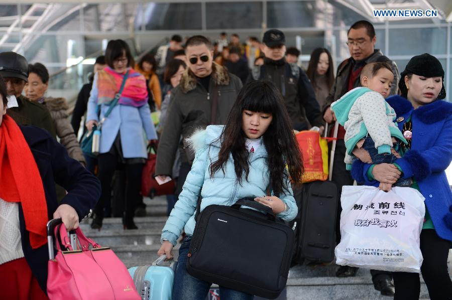 Passengers prepare to get on trains at the Railway Station in Xining City, capital of northwest China's Qinghai Province, Feb. 23, 2015. China saw a passenger flow return peak on Monday as the week-long Lunar New Year holiday drew to an end. (Xinhua/Zhang Hongxiang)