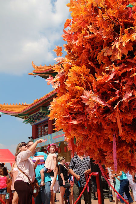 A mother throws a coin tied with a piece of ribbon with her wish on it to the Wishing Tree. It is said that if one’s ribbon is attached onto the Tree without falling, his dream will come true. (People's Daily Online/ Zhang Jiexian)
