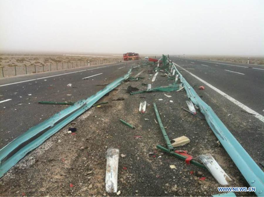 Photo taken on Feb. 25, 2015 shows the scene of a road accident site in Bachu County, Kashgar Prefecture, northwest China's Xinjiang Uygur Autonomous Region. A long-distance bus overturned on an expressway which links Kashgar with Aksu,