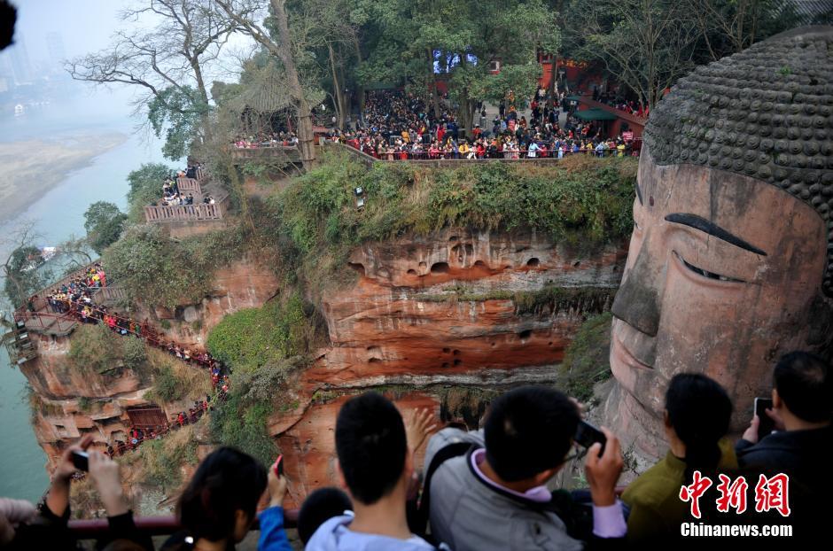 Hundreds of thousands of people climb all the way up to have a look at the big Buddha in Leshan Mountain, southwest China's Sichuan province on Feb. 19, 2015. (CNS/Liu Zhongjun)