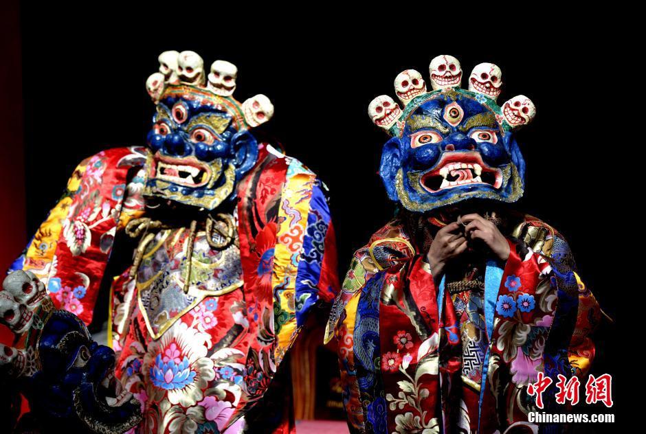 Two monks put on masks to get ready for dancing in Chubu Temple, about 7 kilometers away from Lhasa, southwest China's Tibet Autonomous Region on Feb. 18, 2015. (CNS/Li Lin)