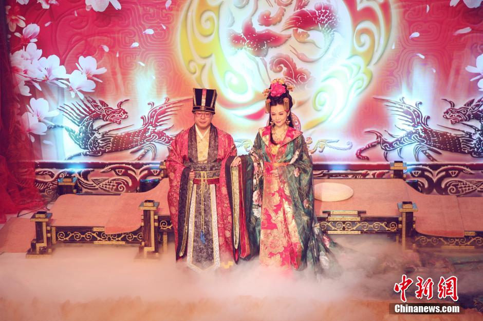 A Chinese couple wears traditional Hanfu at their wedding ceremony in Hangzhou, east China's Zhejiang province on Feb. 23, 2015. (Chinanews.com/Ye Zi)