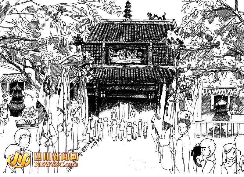 Ma Hairui’s pen sketch of a historical site in Deyang, Southwest China’s Sichuan province during the Spring Festival holiday. (Photo/newssc.org)