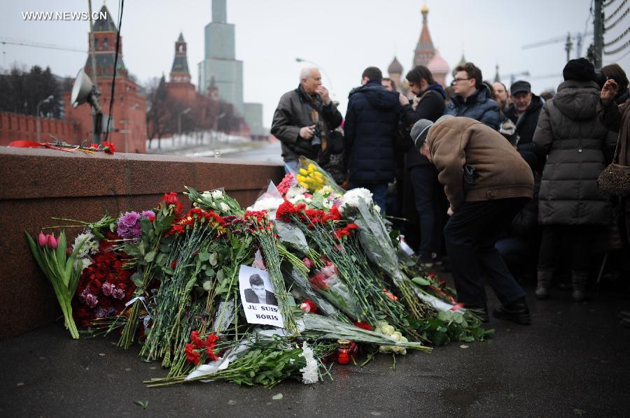 A man lays flowers on the murder site of Russian opposition leader Boris Nemtsov in Moscow, Russia, on Feb. 28, 2015. People came to the murder site of Boris Nemtsov for mourning on Saturday. Boris Nemtsov was shot and killed near the city center on Feb. 27, 2015. (Xinhua/Dai Tianfang)