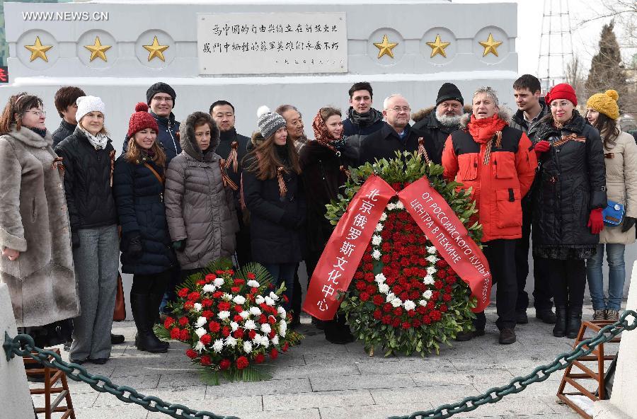 Representatives of Russians living in Harbin, capital of northeast China's Heilongjiang Province, pose for a group picture after laying flowers at Soviet martyrs monument in Harbin, Feb. 28, 2015. Dozens of Russians living and working in Harbin attended a commemorative activity for Soviet Red Army soldiers who sacrificed during World War II on Saturday. The monument was set up in 1945 to commemorate Soviet soldiers who were killed in the fight against the Japanese invaders in China. (Xinhua/Wang Jianwei)