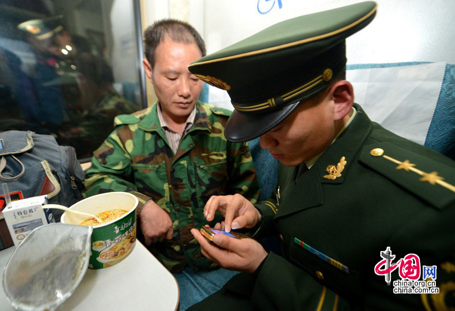 Qian Hui, an armed policeman of Chongqing Armed Police Corps, inputs his contact information in Teng Xingguo's telephone. (China.com.cn/Cao Feng)