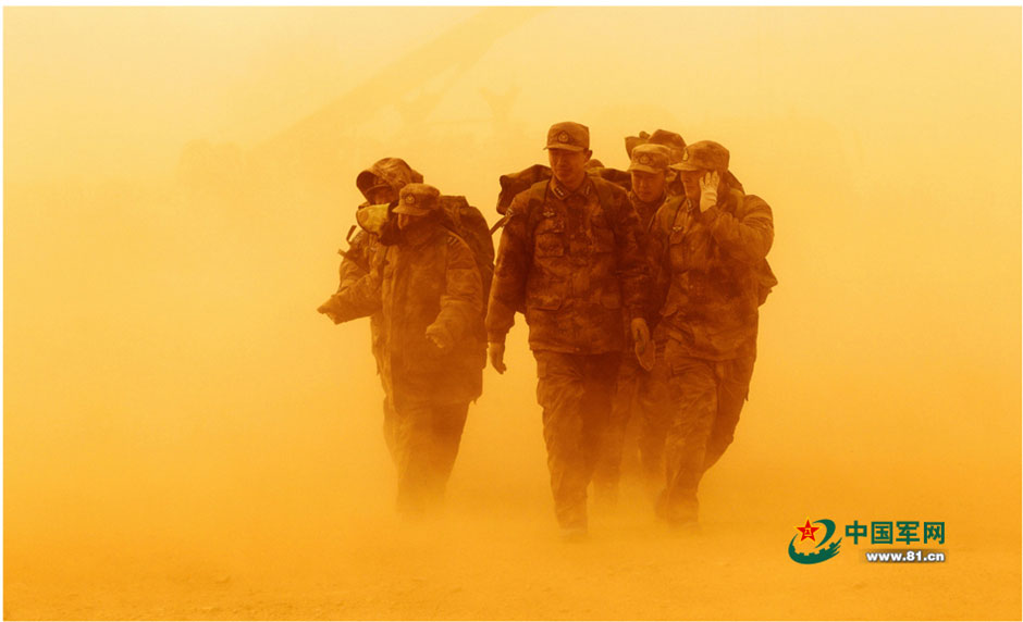 Soldiers participate in military training in the desert. (Photo/www.81.cn)